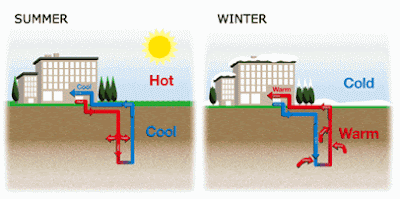 Excessive space heat from air-conditioning in summer will not simply be blown into the atmosphere. The heat is transferred into the underground via the borehole heat exchangers and will increase the existing heat potential of the earth. The same system is used to extract the heat in winter from the underground and make it available for the heating of the building with a heat pump.